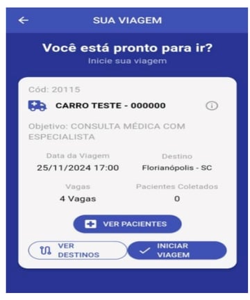 - Ao selecionar a opção “Ver pacientes”, o aplicativo exibirá os pacientes vinculados à viagem;