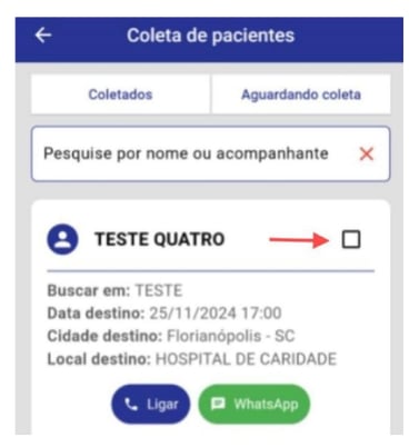 - Após o início da viagem e o preenchimento das informações obrigatórias, ao buscar os pacientes, o motorista deverá registrar a coleta selecionando o nome do paciente e marcando-o como coletado no checkbox;