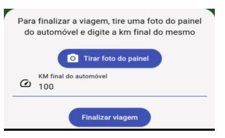 - Ao retornar, ao final da viagem, o profissional deverá tirar uma foto do painel do veículo e informar o KM final. Em seguida, deverá clicar na opção “Finalizar viagem”.